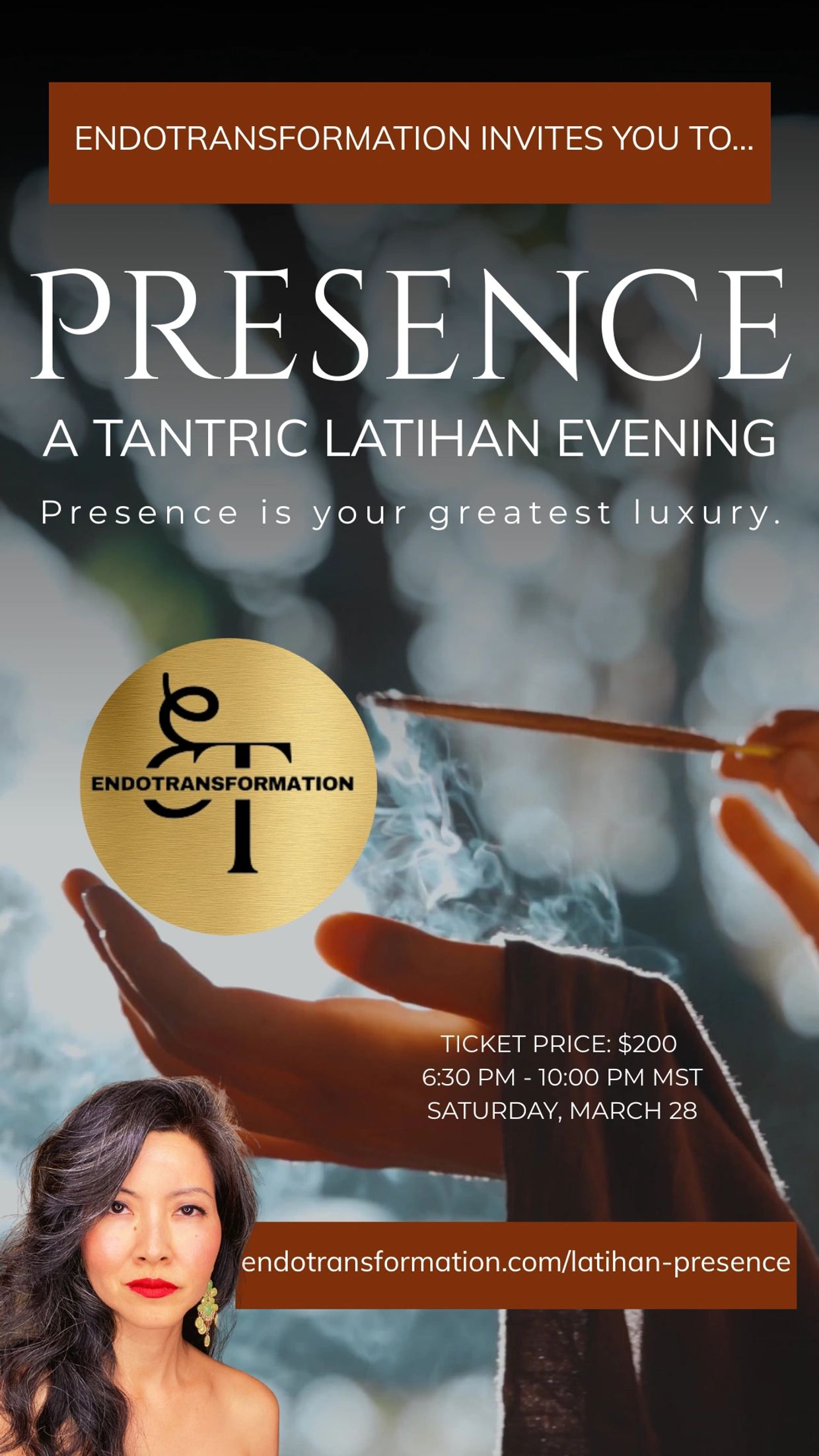This is not escape. This is remembrance. Join us for a Tantric Latihan: Presence ™. A magical boutique evening immersion Saturday, March 28, 2026. The location will be emailed to you 48 hours before the event.